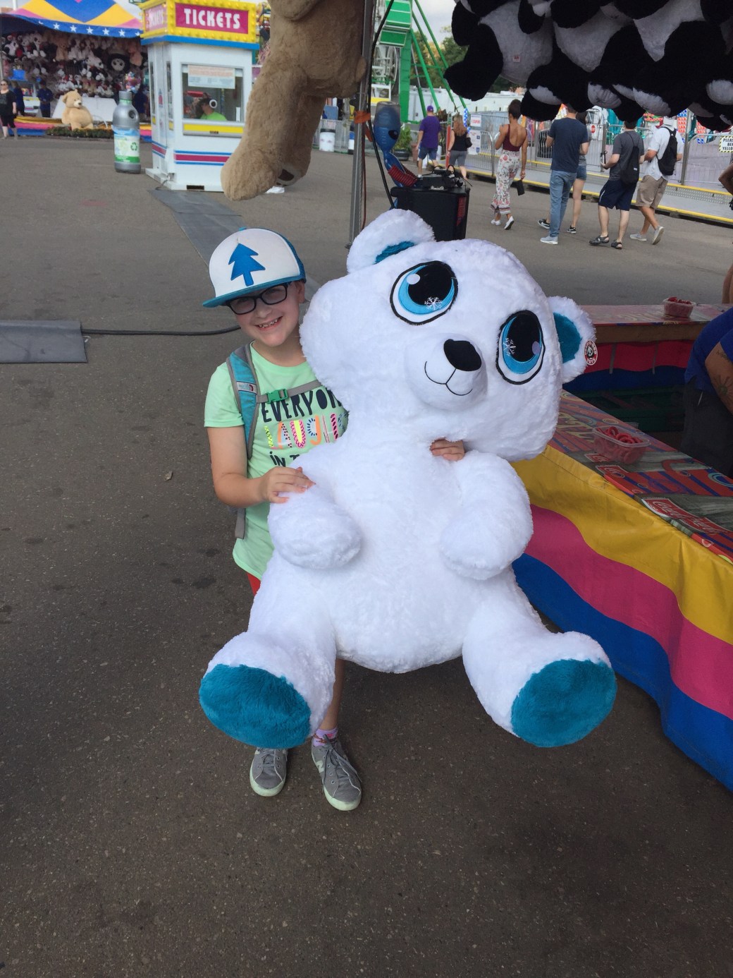 - They should have a Giant Stuffed Animal check, like a coat check, so that you don’t have to carry the ridiculous huge stuffed animals everywhere when your daughter wins one at 11 am. Side note: those stuffed animals are remarkably light. I’ve never had a friend or anyone I was with win one before, so I didn’t know. Annika won it at the ring toss. Wild.