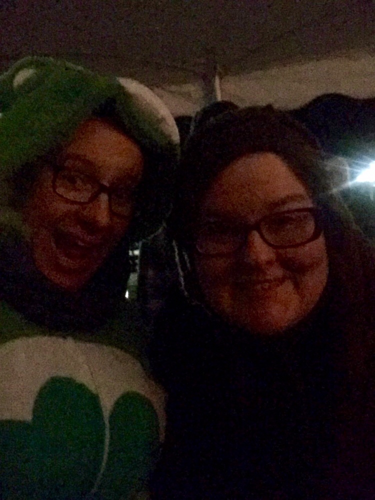We could see our breath this morning and we can see it again now. We’re sitting out in the field by the river, listening to The Lil Smokies right now. Annika has crawled into the back of our pop-up shelter, curled up in a blanket, and fallen asleep. I don’t know how she is sleeping in this cold on the tarp floor, but she is. She’s amazing. She has been running around all day. It’s no wonder she’s so tired. Anders is tending the festival fire and has been all day. He’s talking to all sorts of people and enjoying his freedom. I have a bunch of layers on, all covered by a Care Bear fleece union suit I got last year. I’m really toasty, actually. Dancing around, I actually got too hot.