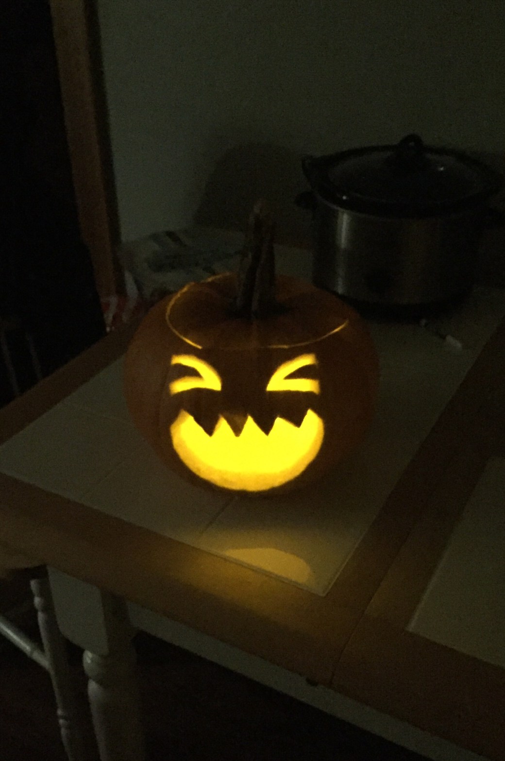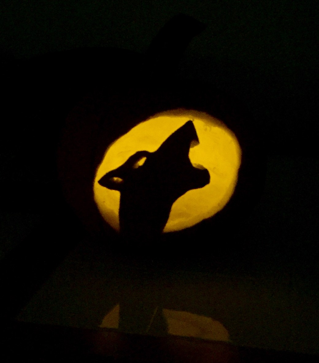 Still: we have pretty cool pumpkins tonight. Here’s mine and Annika’s (Dak drew the wolf and Annika carved most of it).